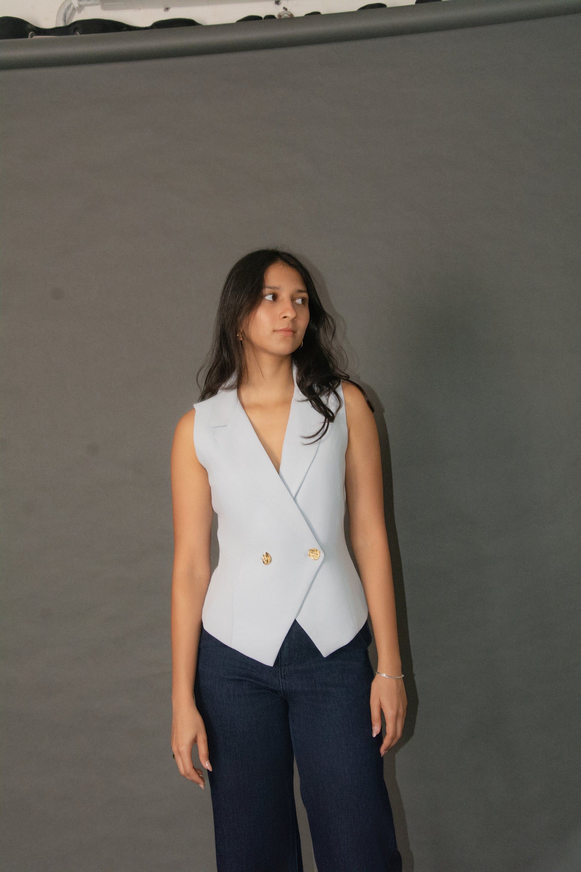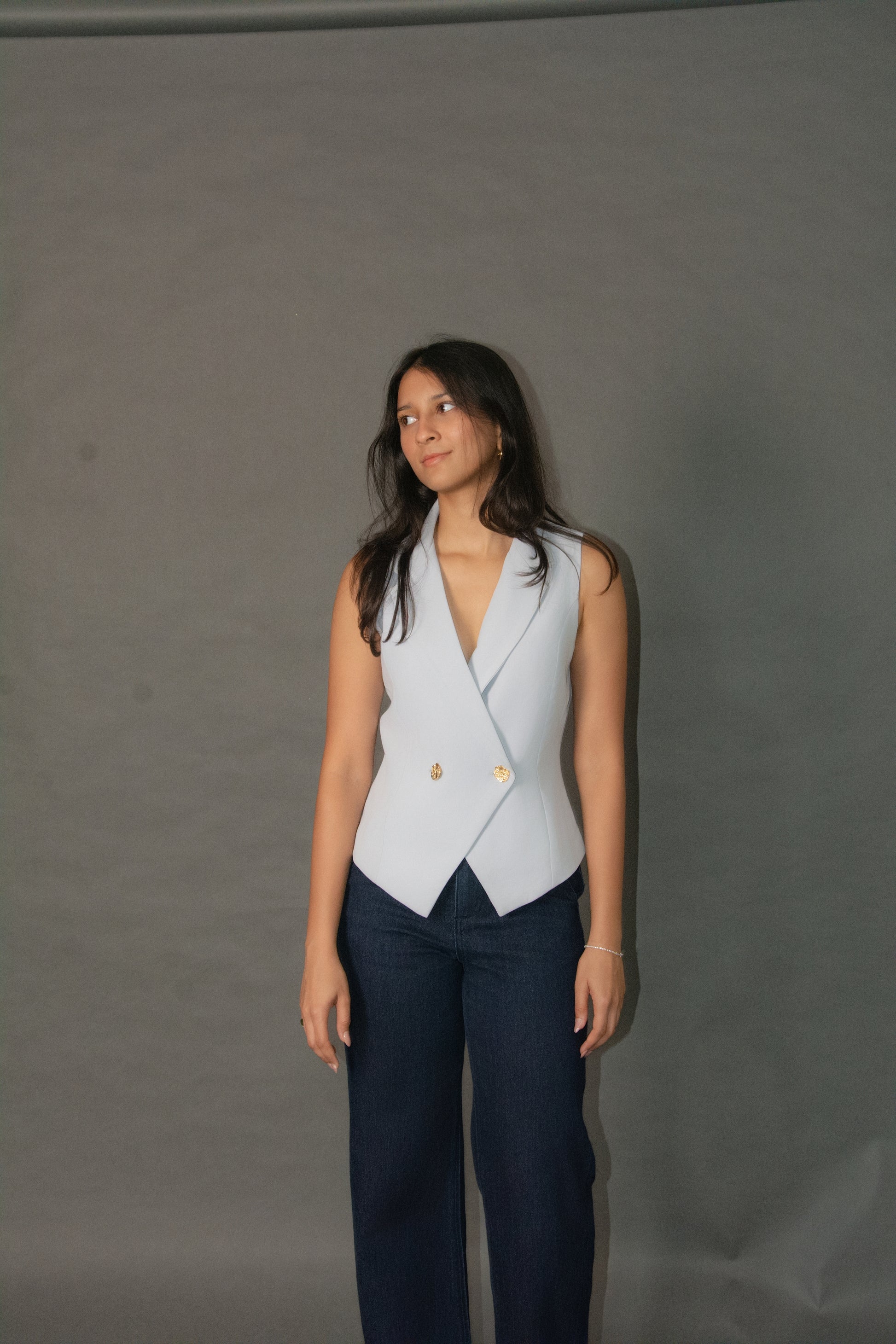 Structured yet feminine, our Noa Double Breasted waistcoat is a sharp essential for the modern wardrobe. Designed with two functional gold buttons and a tailored fit, it’s an effortless choice for office hours, events, and everything in between.